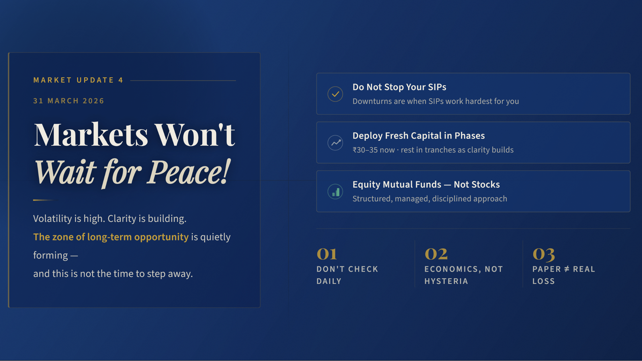 If you have ₹100 → deploy ₹30–35 now, and stagger the rest.